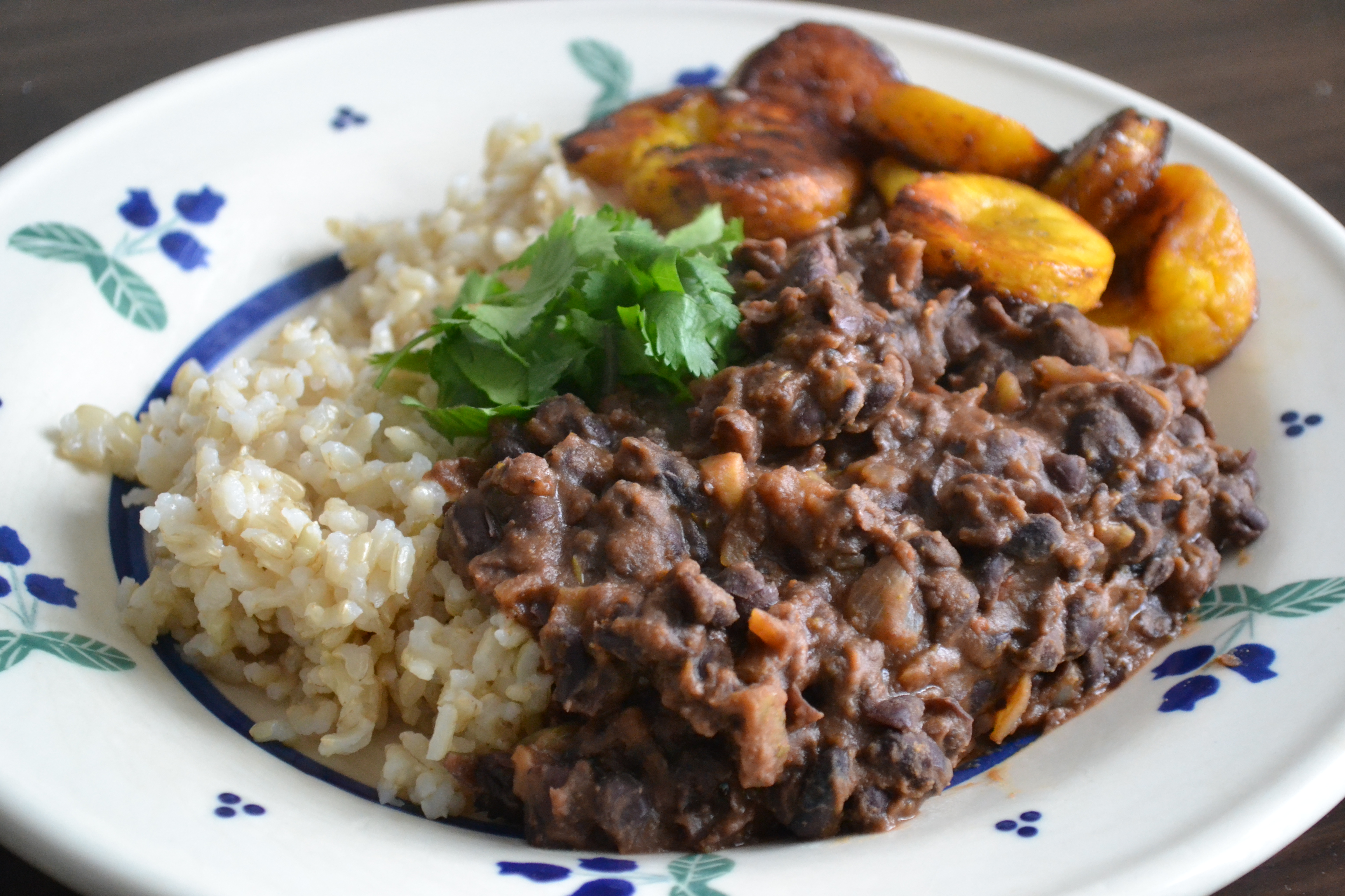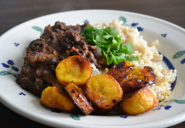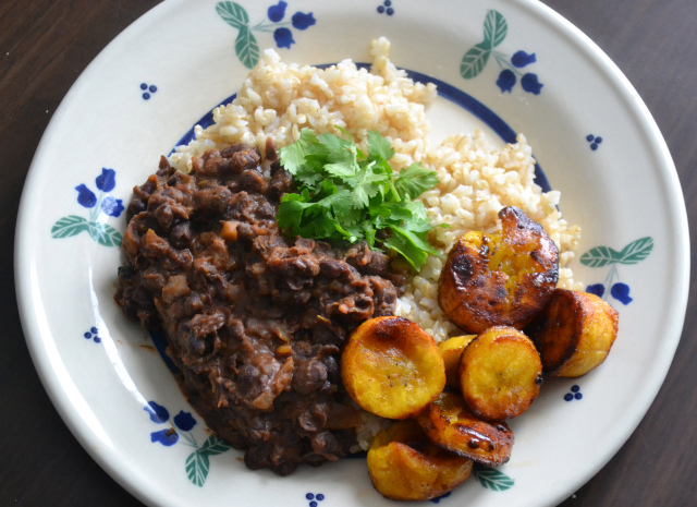 Now you can get to plating. Add a scoop of brown rice on your plate. Add half the black beans. Add half of the plantains and you’re done! If you want to be fancy (or awesome) you could add some chopped scallions or cilantro. My boy loooooves cilantro so of course he threw a giant handful on top and mixed it all around.